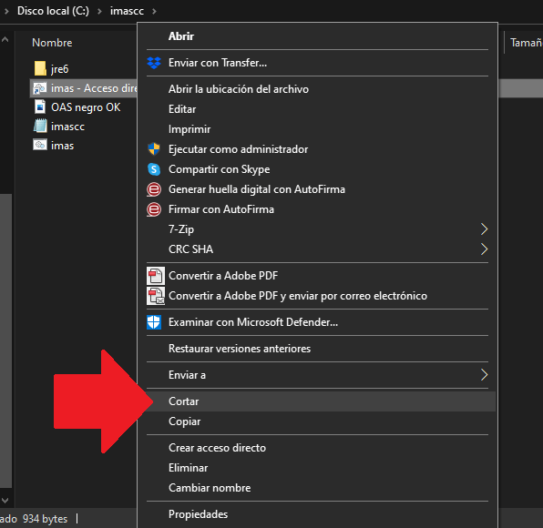 Para ello situados encima de este archivo «imas – Acceso directo» pulsaremos el botón derecho de nuestro ratón y elegiremos la opción de «CORTAR».