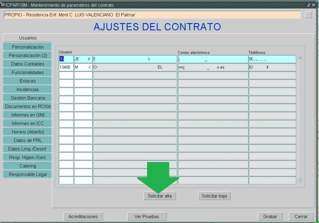 En ella verá los datos más importantes de su contrato. Verá diversas pestañas: USUARIOS, PERSONALIZACIÓN, PERSONALIZACIÓN 2, DATOS CONTABLES, FUNCIONALIDADES, ENLACES, INCIDENCIAS, GESTIONES BANCARIAS Y DOCUMENTOS…. Es en USUARIOS donde usted tiene que entrar para la gestión de bajas y altas. Para entrar en ella pulse encima de la pestaña USUARIOS.