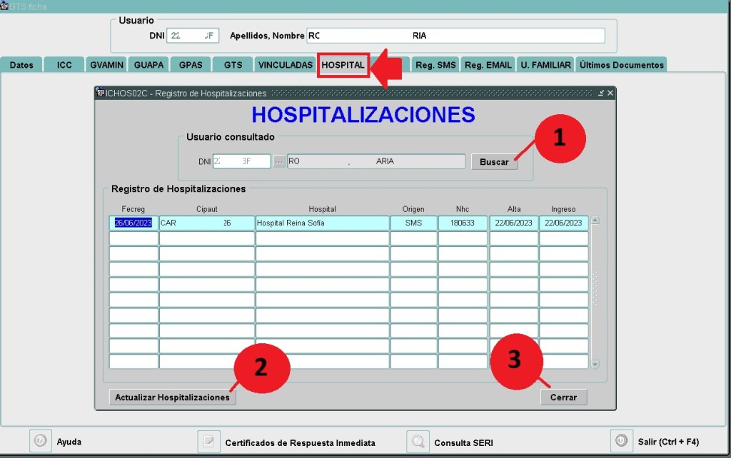 1. Botón de BUSCAR. pulsaremos y nos traerá las hospitalizaciones hasta el momento registradas.