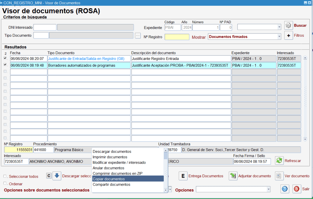 Por ello en ROSA visor hemos dejado una utilidad por la que podéis marcar varios documentos que copiar a uno o varios expedientes. Para ello os facilitamos el siguiente video: