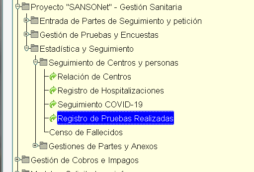 Se implementa el REGISTRO GENERAL DE PRUEBAS (no confundir con el Registro General de Petición de Pruebas). El registro general de pruebas realizadas informa de todos los resultado de pruebas alojado en la base de datos SIBRE (Base de Datos de Epidemiología) solo de los usuarios o trabajadores incluidos o declarados en SANSONET. Es decir, no se obtienen de todos los ciudadanos de los que se tiene resultados, solo de aquellos que son usuarios de servicios en SANSONET o está como profesionales o trabajadores de los centros de servicios declarados en SANSONET. Por lo que el sistema nos devolverá los resultados de las pruebas de esta población (SANSONET) con independencia de que la prueba haya o no haya sido pedida a través de SANSONET.