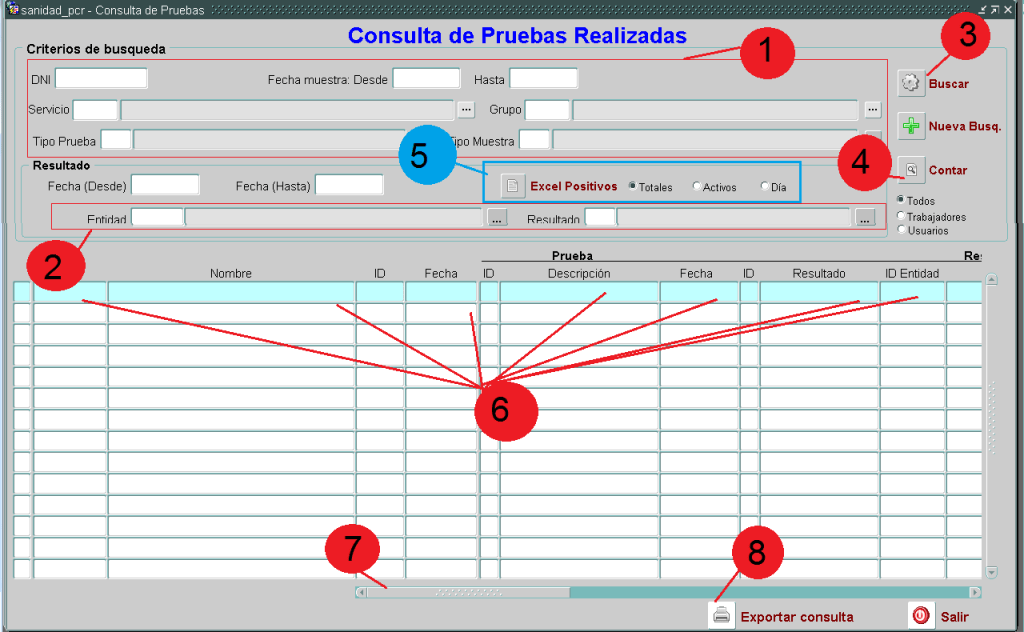 (1) BLOQUE DE FILTRO DE BÚSQUEDAS: DNI. Nos permite indicar un DNI a buscar. Vacío todos.Nos permite filtrar por diversos conceptos: tipos de muestra, tipos de prueba, entidad solicitante, entidad realizadora de la prueba, tipo de resultado, fechas de resultados, etc.. Vacío es todos. Todo ellos entre las fechas de resultados indicadas. Vacías todas.