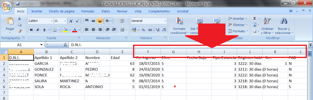 Cuarto. Como resultado de esta opción nos generará un excel con todos los usuarios y muchos datos en muchas columnas. Desde la columna F (fecha de ingreso), hasta la última columna que tenga datos, las iluminaremos y las eliminaremos.