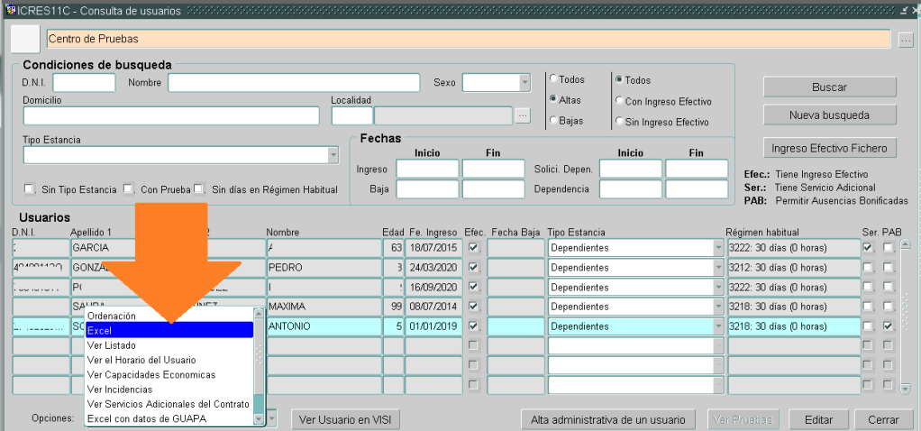 Tercero. Le daremos a BUSCAR para que nos aparezcan todos, y una vez los tengamos a la vista en la pantalla, desplegaremos la lista de OPCIONES y escogeremos EXCEL.