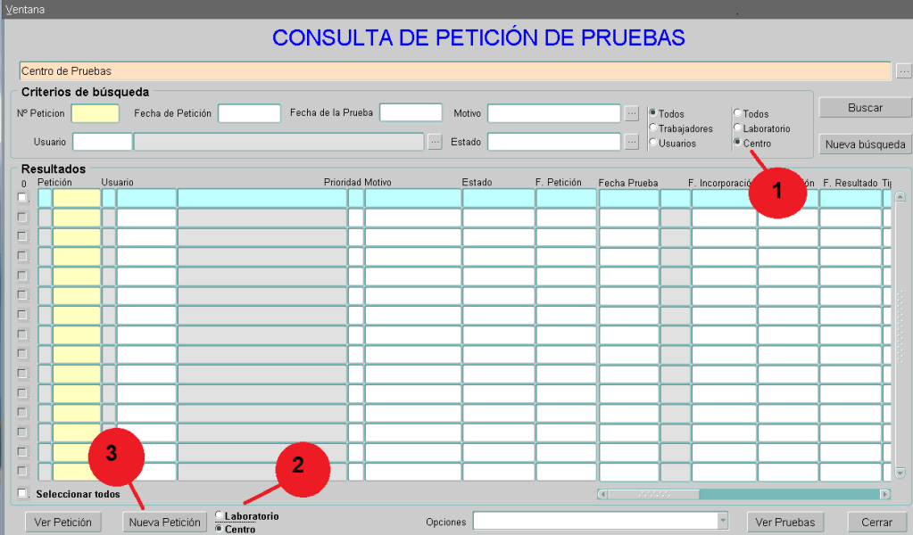 (2) Check de tipo de PRUEBA. Check con el que le indicaremos al botón de Nueva petición si la petición que queremos realizar, es de Laboratorio o de Centro. Una vez seleccionada al pulsar el botón (3)…
