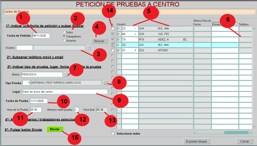 (14) CHECK. Para seleccionar o deseleccionar a los trabajadores o residentes a los que citamos para la prueba.