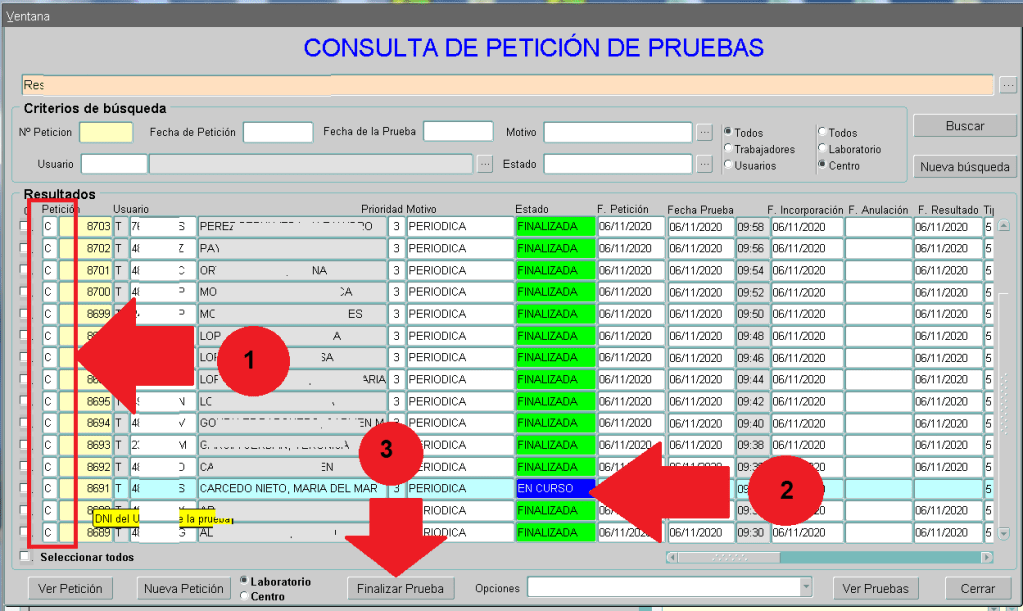 (1) Filtro CENTRO/LABORATORIO/TODAS. Nos permite filtrar las pruebas que tenemos solicitadas por aquellas que son de Laboratorio (PCR) o aquellas que son de realización local en el Centro.