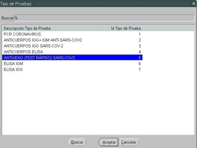 (3) TIPO DE RESULTADO. Le indicaremos el resultado obtenido, de la listad de los posible dependiendo de la prueba realizada. En el caso de los antígenos será POSITIVA o NEGATIVA.