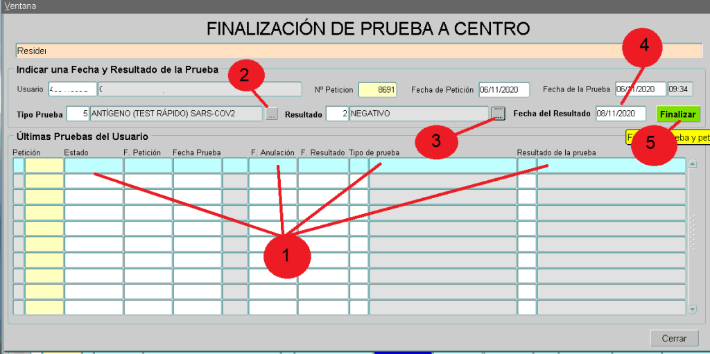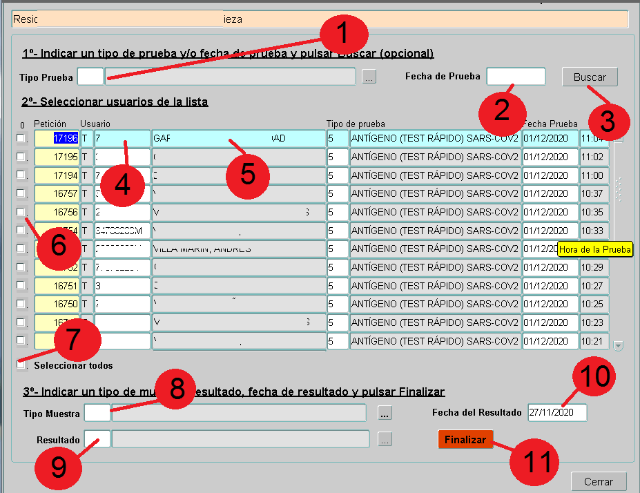 Lo haremos como hasta el momento lo hemos hecho. Iremos seleccionando de las pruebas en curso cada uno de los casos positivos y finalizando la prueba como POSITIVA. Recordamos, uno a uno asegurándonos estar en la prueba de la persona positiva. Para ello una vez seleccionada la persona: