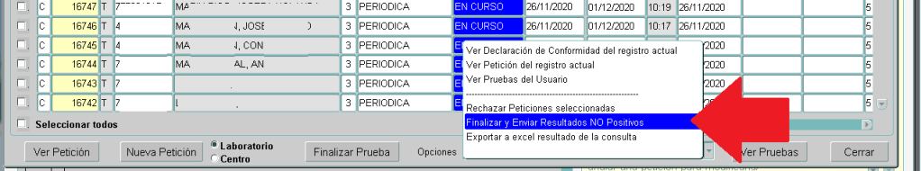 Una vez tenemos ya resueltos los positivos, las restantes pruebas del día son negativas. Con el fin de que no vayan marcando de una en una y al poner el resultado se pueda equivocar marcando POSITIVO, hemos creado una opción que le permitirá resolverlas todas las restantes o aquellas que usted crea, pero solo le permitirá ponerlas en modo NEGATIVAS. Para ello pulse el desplegable que tiene en la parte inferior derecha y les desplegará un listado de opciones: