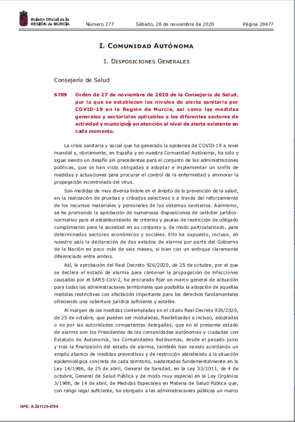 Orden de 27 de noviembre de 2020 de la Consejería de Salud,por la que se establecen los niveles de alerta sanitaria por COVID-19 en la Región de Murcia, así como las medidas generales y sectoriales aplicables a los diferentes sectores de actividad y municipios en atención al nivel de alerta existente en cada momento.