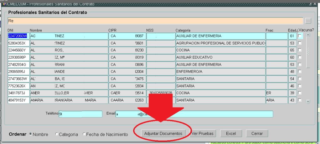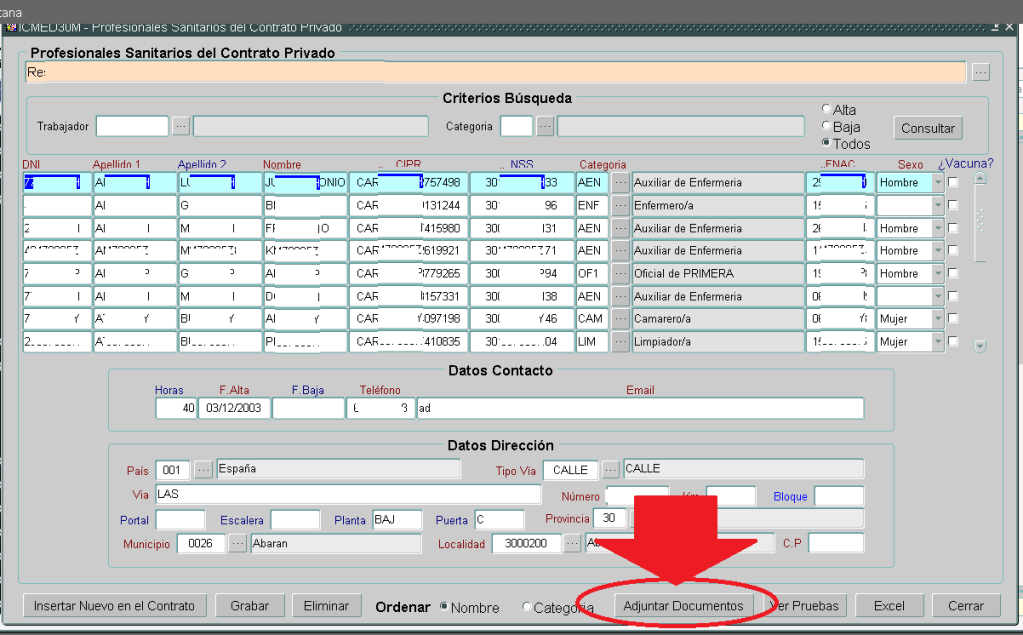 Una vez pulsamos esta opción, nos mostrará una vista con todos los trabajadores. Nos situaremos en el trabajador y pulsaremos el botón de documento adjuntos.