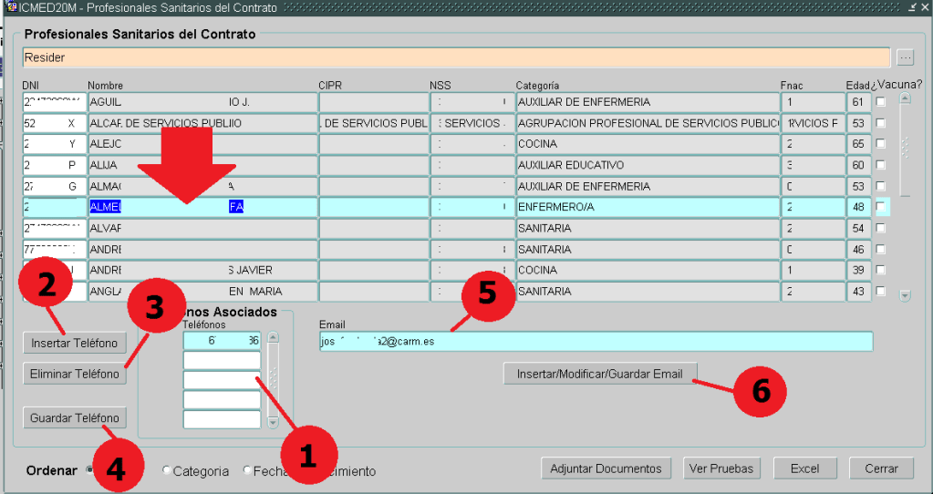 (6) INSERTAR/MODIFICAR/GUARDAR. Botón por el que guardará los cambios efectuados en la casilla de email del punto 5.