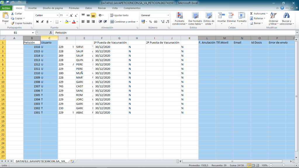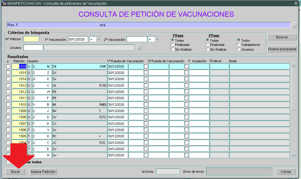 Para obtener el excel que necesitamos, procederemos a filtrar todas las peticiones, indicando la fecha de convocatoria de la primera vacunación o de la segunda. Pulsaremos el botón de buscar y pulsaremos el botón excel.