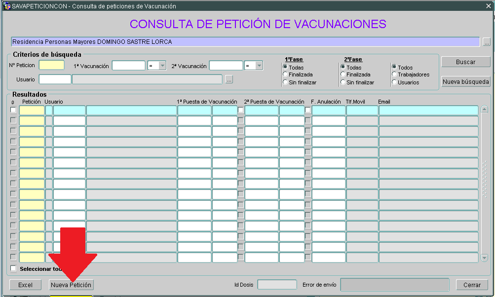 Si lo que deseamos es crear una nueva convocatoria de Vacunaciones, cuando nos muestre el formulario de consulta debemos pulsar el botón de NUEVA PETICIÓN.