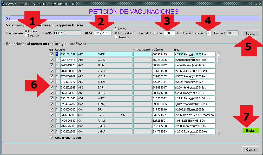 (7) BOTÓN ENVIAR. Genera la petición de convocatoria de todos los trabajadores seleccionados, creando una hora y minutos, intercalados según el valor indicado a partir de la hora de inicio. Enivará un SMS y un email a los trabajadores que tengan los datos introducidos indicándole la fecha de la convocatoria y a la hora de la cita.