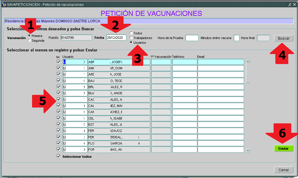 Una vez pulsado este botón el sistema nos mostrará un nuevo formulario por el que nos permite seleccionar a los usuarios y trabajadores que vamos a convocar. En el caso de los trabajadores enviará un SMS y un email comunicándole la fecha de la vacunación y la hora de la cita generada. Por ello aconsejamos se genere en dos fases, la primera los trabajadores indicando la cita de la prueba y la segunda los usurios y residentes sin hora concreta.