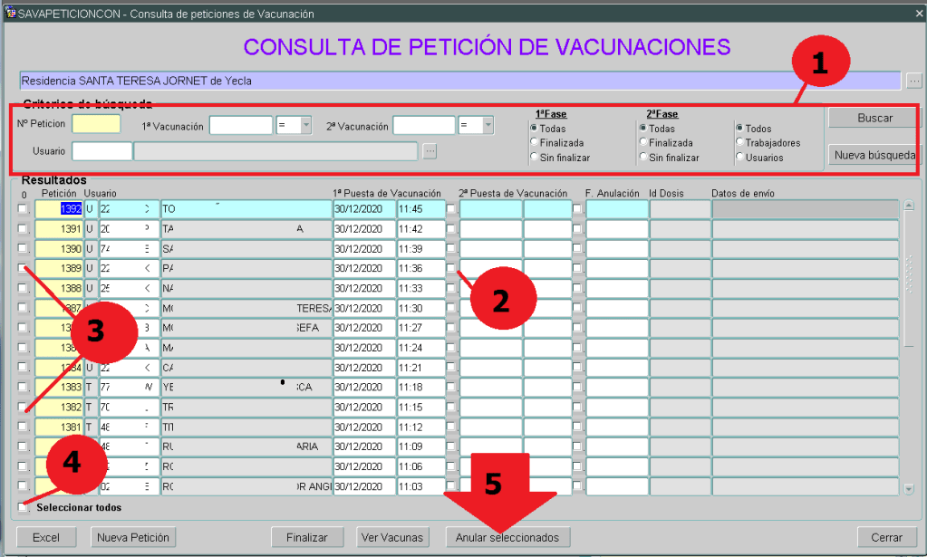 Una vez tenemos todas las personas no asistentes a la convocatoria pulsaremos el botón ANULAR SELECCIONADAS (5).