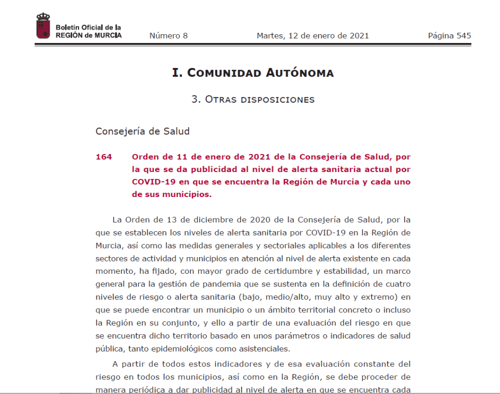 Orden de 11 de enero de 2021 de la Consejería de Salud, por la que se da publicidad al nivel de alerta sanitaria actual por COVID-19 en que se encuentra la Región de Murcia y cada uno de sus municipios.