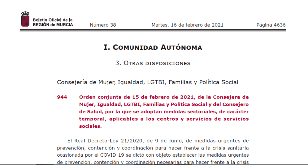 Orden conjunta de 15 de febrero de 2021, de la Consejera de Mujer, Igualdad, LGTBI, Familias y Política Social y del Consejero de Salud, por la que se adoptan medidas sectoriales, de carácter temporal, aplicables a los centros y servicios de servicios sociales.