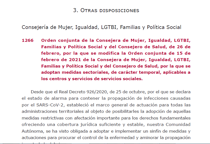 Orden conjunta de la Consejera de Mujer, Igualdad, LGTBI, Familias y Política Social y del Consejero de Salud, de 26 de febrero, por la que se modifica la Orden conjunta de 15 de febrero de 2021 de la Consejera de Mujer, Igualdad, LGTBI, Familias y Política Social y del Consejero de Salud, por la que se adoptan medidas sectoriales, de carácter temporal, aplicables a los centros y servicios de servicios sociales.