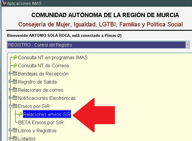Tal y como indicábamos, estos documentos se quedan pendientes de ser enviados de modo automatizado desde ENVIOS SIR. Encontraremos estos documentos dentro de la aplicación de Registro REGISTR@-IMAS, en la opción de envíos SIR.