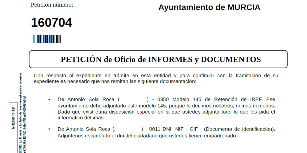 Una vez detallamos los documentos que solicitamos y sobre que interesados de expediente (recuerde que esta petición va por expediente e interesado), PETIDOC elabora el documento, lo sella con el sello de organismo DUMAS, lo sube a ROSA, lo deja pendiente de envío por SIR desde REGISTR@-IMAS.