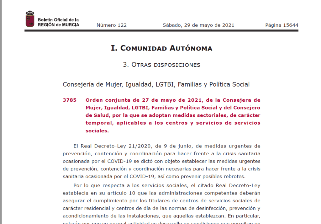 El objeto de la presente Orden es acordar medidas de carácter temporal para hacer frente a la COVID-19, no sólo de naturaleza restrictiva sino también de carácter preventivo y de contención, aplicables a centros y servicios de servicios sociales ya sean públicos, concertados o privados de la Región de Murcia, con la finalidad de establecer un marco normativo con el que proteger y mitigar el impacto de la pandemia de COVID-19 en el segmento de población más vulnerable como son, entre otros, las personas mayores y las personas con discapacidad.