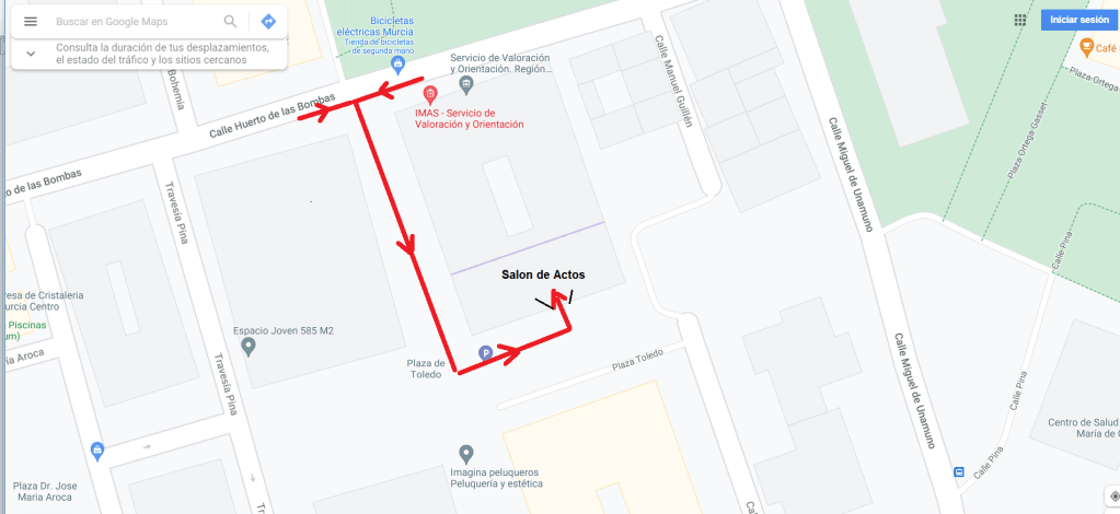 El llamamiento se producirá en el salón de actos del Servicio de Valoración, sito en la calle Huerto de las Bombas, 8 de Murcia. El acceso al mismo se hará por la puerta trasera, a través del lateral del inmueble, ubicada en la Plaza de Toledo, conforme se indica a continuación: