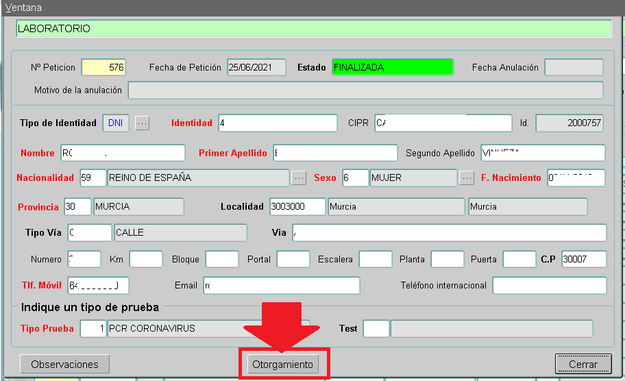Una vez introducidos los datos de petición de la prueba, podremos pulsar el botón OTORGAMIENTO y el sistema nos imprimirá el otorgamiento preparado para la firma del peticionario.
