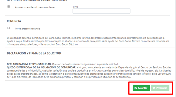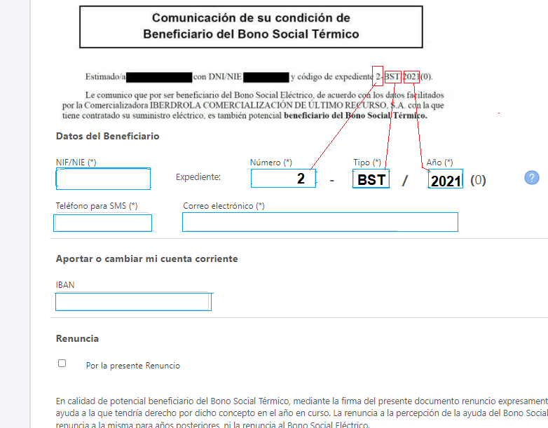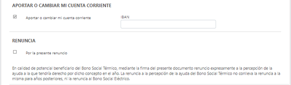 De forma adicional a los datos de identificación del beneficiario, se permite introducir información relativa a introducción de datos de cuenta corriente o solicitar renuncia a bono social térmico de este año.