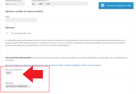 En caso de que toda la información sea correcta, se mostrará mensaje de operación realizada con éxito, y se mostrará casilla para introducir clave de confirmación previa a presentación de solicitud: