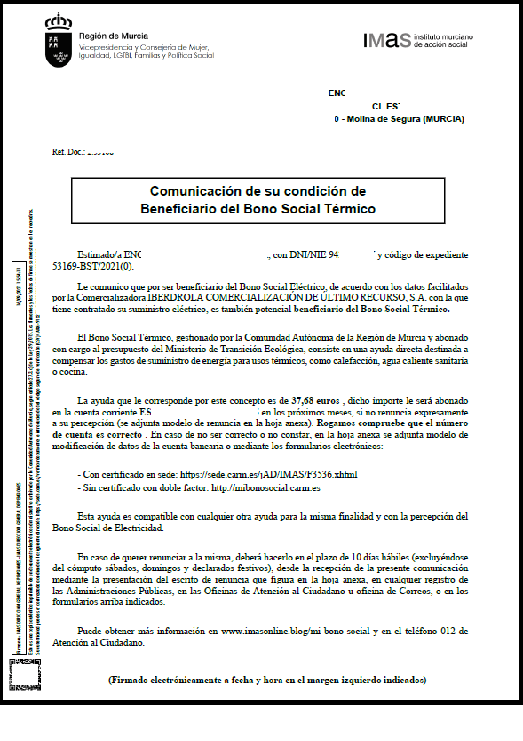 A partir del 6 de octubre de 2021 se remitirá a todos los beneficiarios del Bono Social Térmico una comunicación en SEDE ELECTRÓNICA y por correo a su domicilio, con la finalidad de que comuniquen su renuncia en el caso de no desear la ayuda o para que actualice, su IBAN por el que cobrar la ayuda.