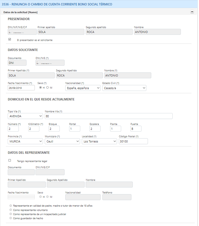El solicitante deberá de cumplimentar datos obligatorios de solicitante, domicilio de residencia, y datos de contacto (campos marcados con (*)