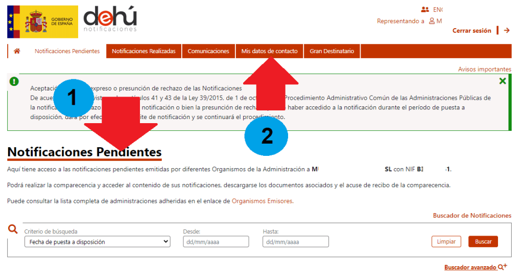 (1) Panel de notificaciones pendientes: Nos muestra las notificaciones pendientes que tenemos, con los diversos filtros, las podemos acotar por fechas, pendientes o recibidas, caducadas, etc..