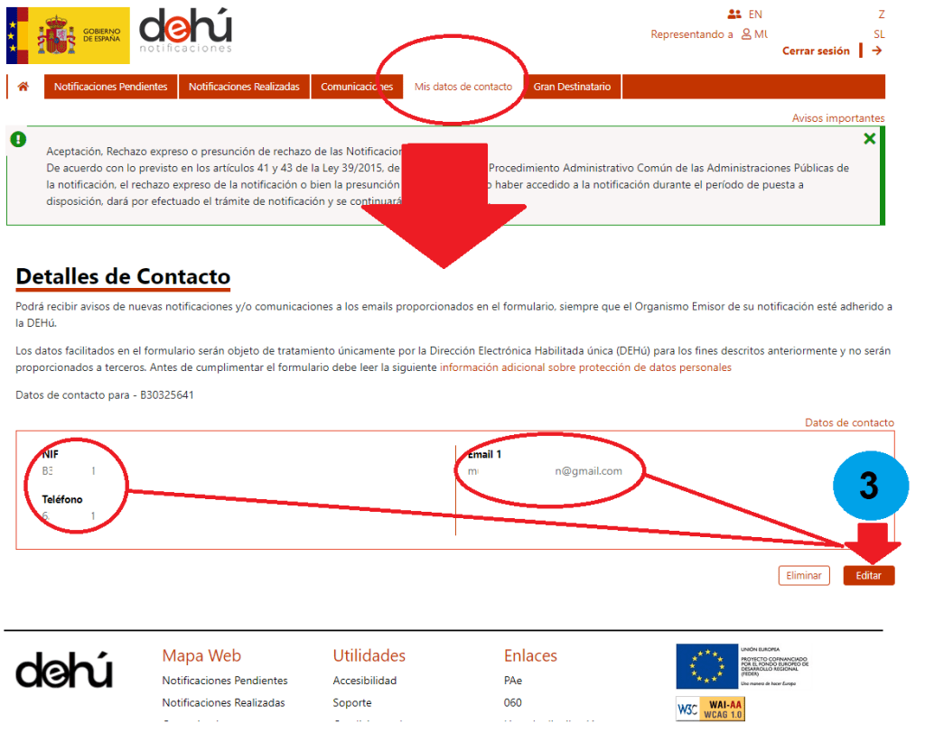 (2) Mis datos de contacto: Indicaremos el teléfono y email al que queremos que nos notifique en cuanto llegue una notificación. (Hay que hacerlo una primera vez, tengamos o no algo por recibir si queremos que cuando llegue alguna notificación nos informe).