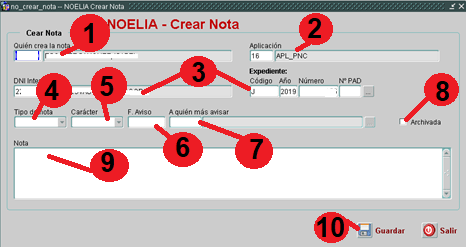 (1) Login del creador de la nota (heredado de la persona que entra), Aplicación con la que se está operando (la hereda), DNI del interesado (lo hereda del expediente), Expediente (lo hereda del expediente en que se encuentre).
