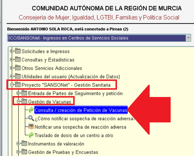 Para obtener un listado en excel de registro de dosis inoculadas a los usuarios y trabajadores de mi centro, nos iremos a la opción PROYECTO DE SANSONET, dentro de ella, GESTION DE VACUNAS, y por último escogeremos la opción CONSUTA/CREACION PETICIONES DE VACUNAS.
