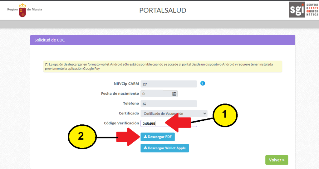 Al introducir el código de activación(1) se activa el botón de descarga del certificado (2) al pulsarlo se le descargará el certificado en formato PDF en su móvil.