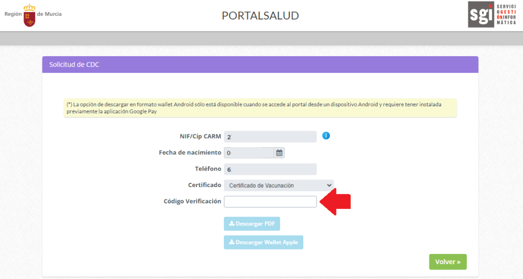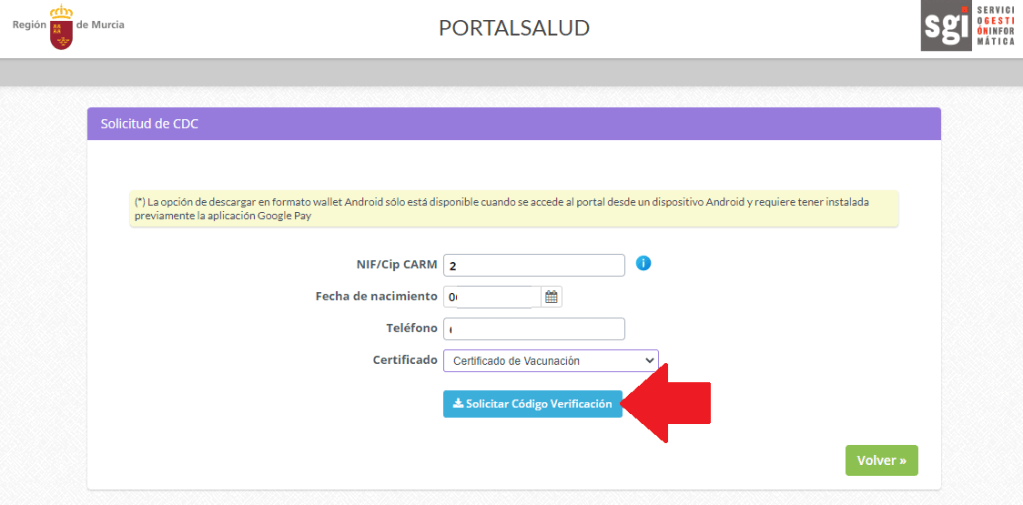Pulsaremos el botón de SOLICITAR CODIGO DE VERIFICACIÓN. El sistema enviará un código de activación al teléfono móvil que tiene usted registrado en su ficha de Salud Pública.