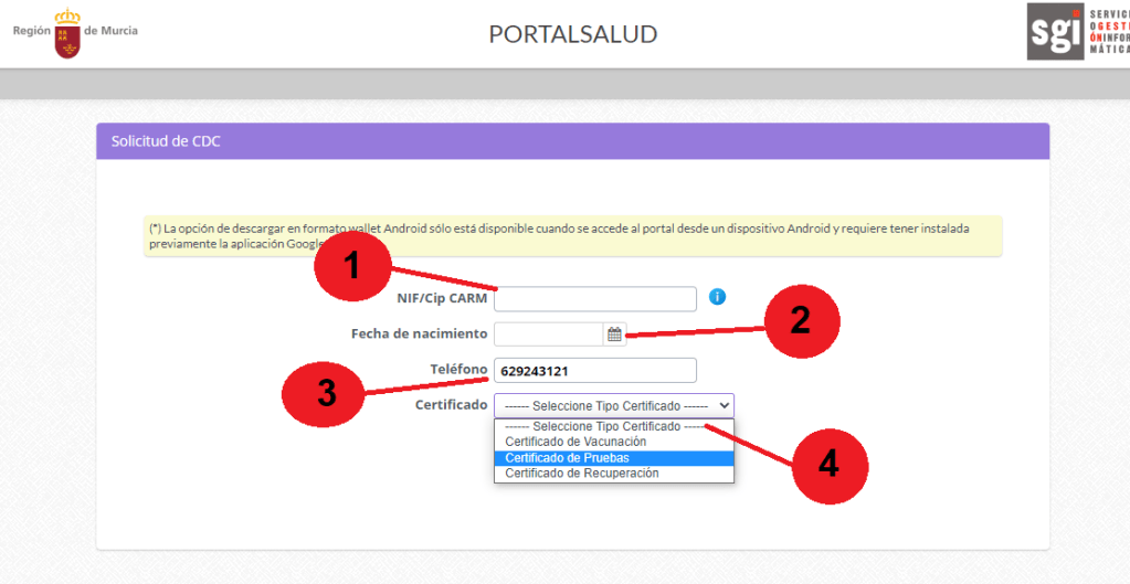 (3) TELÉFONO Número de teléfono con el que está registrado en Salud Pública, y al que le enviará la clave de activación. En el caso de laboratorios que al introducir la prueba, la persona no estaba registrada en el sistema de Salud Pública, y han procedido a la alta de la persona, será el teléfono que registraron al darle de alta.