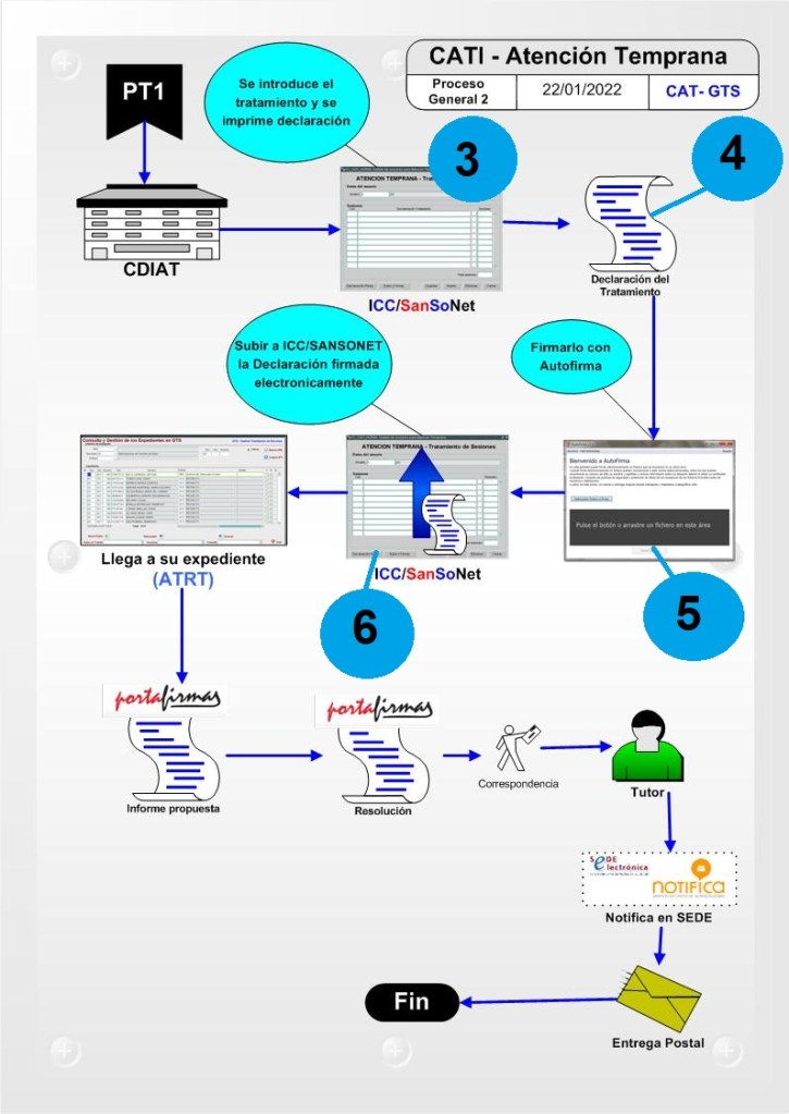 PASO 06. Declaración del tratamiento. Los CDIAT realizaran a través de la plataforma ICC/SANSONET introducirán el tratamiento que está recibiendo el interesado (3). Una vez realizada la introducción del tratamiento (se explica con más detalle más abajo en este articulo), procede a la obtención del documento de declaración (4). Este documento lo firmará electrónicamente con cualquier sistema de firma electrónica que tenga instalado o través de AUTOFIRMA (5). Para ver como se hace mediante autofirma, pinche aquí. Una vez el documento firmado, se procederá a subir este documento a la plataforma ICC/SNASONET con la finalidad de que llegue al expediente del interesado (6). Para saber como se suben documentos al interesado en ICC/SANSONET, pinche aquí.