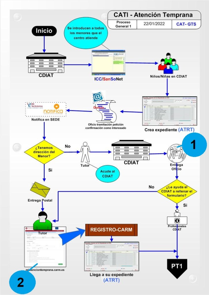 Como explicábamos con anterioridad el interesado puede acudir a CDIAT para recoger u obtener el oficio de confirmación de solicitud (Paso 3, anotación 1 en el gráfico). También el CDIAT puede tener la necesidad de ver este documento, o el emitido por él (Declaración de Tratamiento) o la Resolución final de concesión. Para ello debe seguir los siguientes pasos: