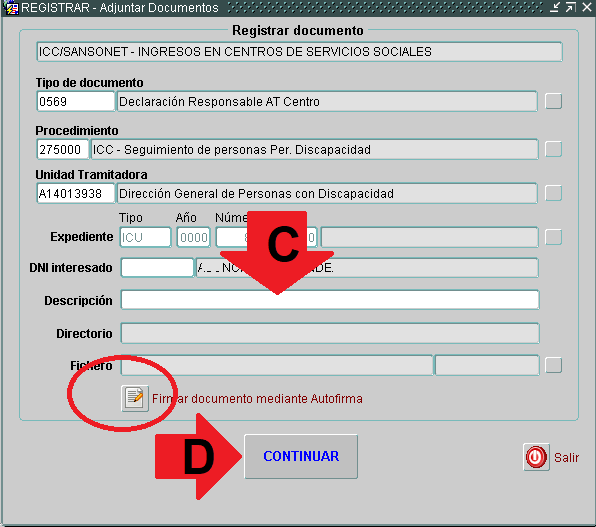 Escribiremos una breve descripción (C) y pulsaremos el botón de continuar (D) por lo que nos solicitará que indiquemos la carpeta y el archivo firmado para ser subido. Una vez subido, llegará un aviso al Departamento de Atención temprana del Imas y se incorporará al expediente del interesado.