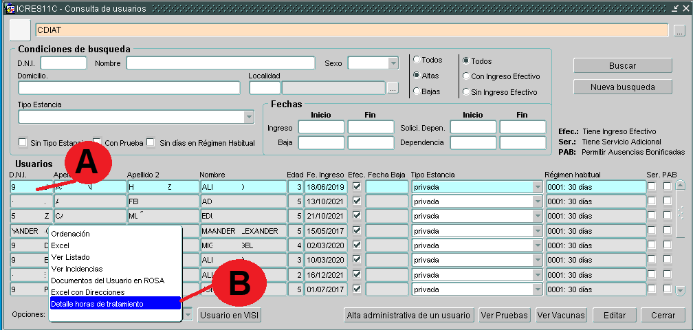 Nos iremos a la opción del menú OPERACIONES DIARIAS, elegiremos la opción de USUARIOS DEL CENTRO. Nos situaremos encima del usuario que deseamos (A) y dentro del apartado de opciones escogeremos DECLARACION DE HORAS (B). Una vez pulsamos esta opción nos llevará al siguiente formulario: