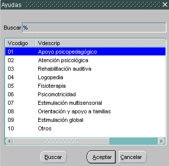 (2) TIPO DE SESION: Introduciremos el código del tratamiento. En caso de no conocer el código pulsaremos el botón de desplegable, donde nos dejará elegir:
