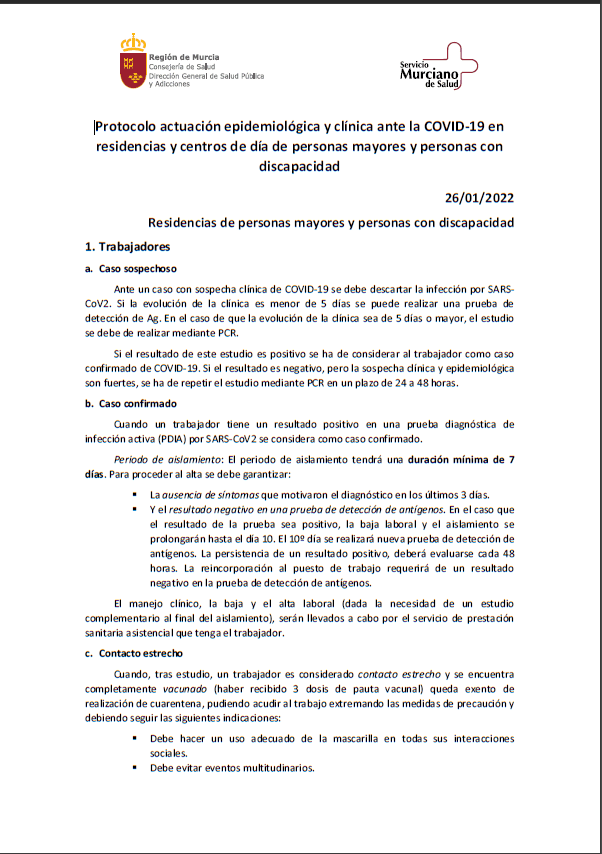 Protocolo actuación epidemiológica y clínica ante la COVID-19 en residencias y centros de día de personas mayores y personas con discapacidad.