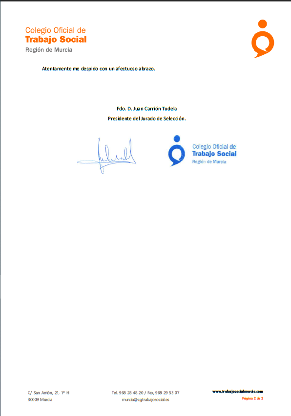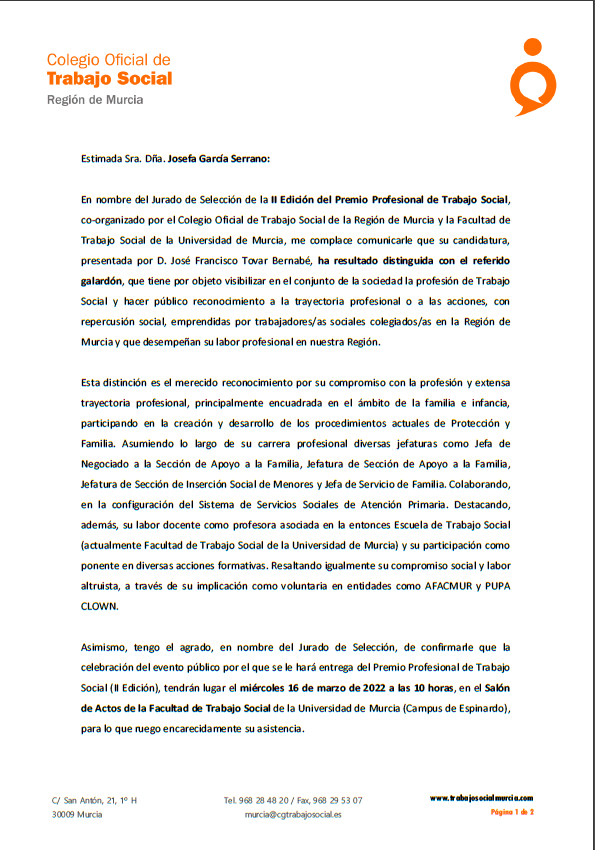 Felicitar al tribunal de esta edición del Colegio Oficial de Trabajo Social de la Región de Murcia, por tan acertada elección.