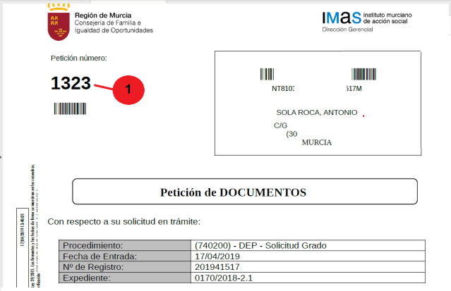 Nuestra carta de petición de documentos dispone unas referencias con las que nos permite trabajar de modo electrónico, fuera del detalle concreto de los documentos que se piden, en su cabecera nos muestra un indicador referencia (1) que combinado con el DNI del interesado nos permite la entrega electrónica de los documentos solicitados.