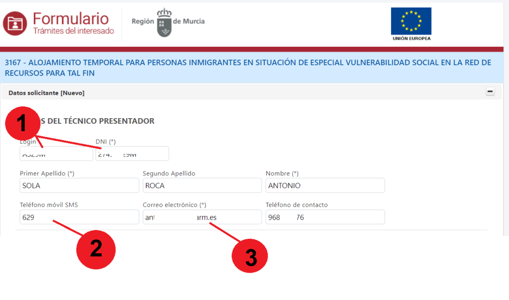 El formulario le solicitará los datos de Técnico Presentador, concretamente los datos de usted, para posteriormente tenerle informado del proceso. Por ello le solicitará el login y su dni. Si usted pertenece a la CARM o tiene usuario en las plataformas VISI/SUSI/ICC los introducirá (en el caso de ICC es ICCxxx, en el caso de SUSI es SUSxxx en el caso de funcionarios de la CARM su login) (1). Introducirá su teléfono móvil (2) importante para el envío de la clave de activación y su correo electrónico (3) por igual motivo.